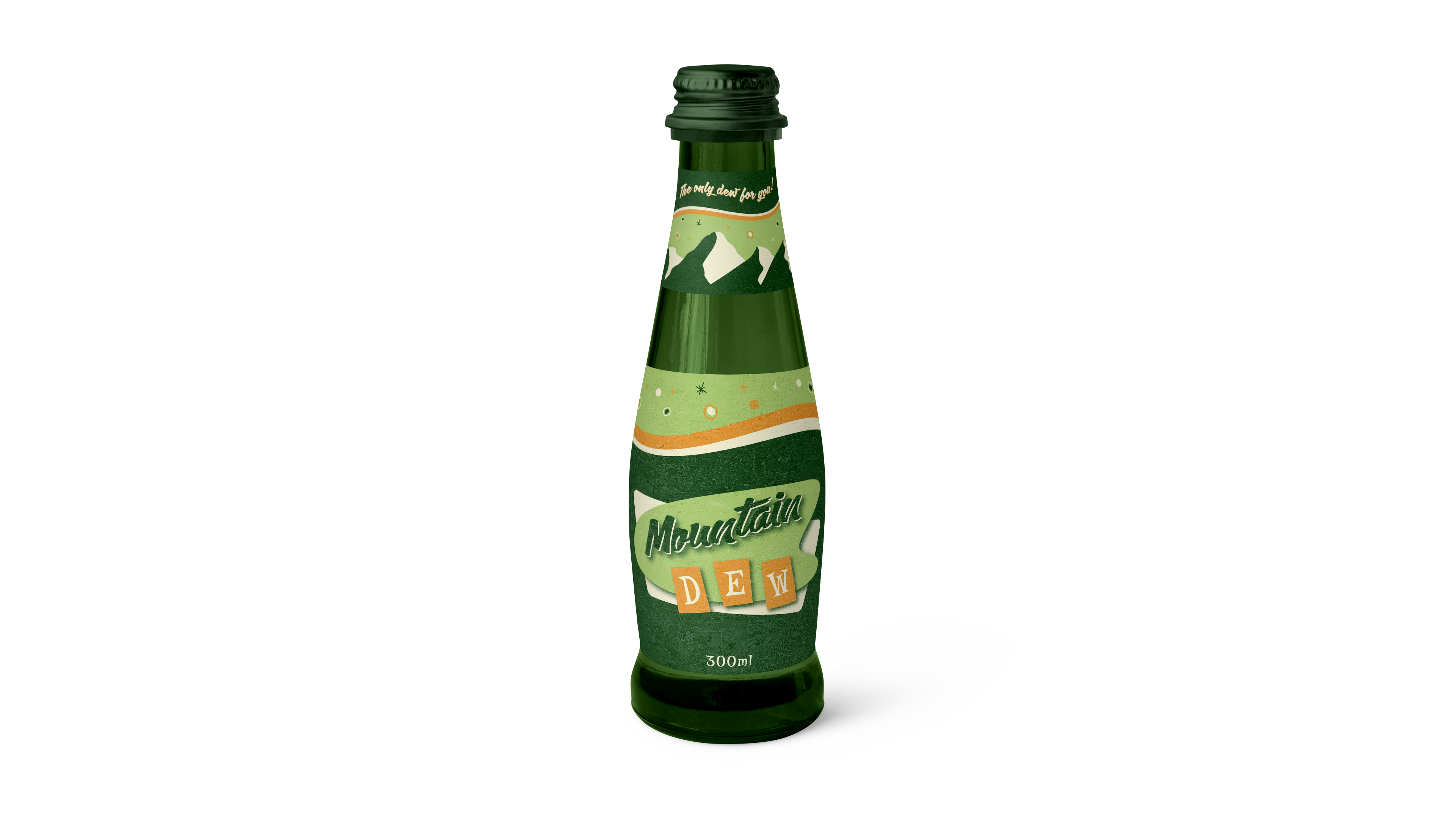 A small upper label for the neck of the bottle was perfect to add some visual interest to the packaging and seemed to be the perfect location for the slogan I created for the brand, "The only dew for you!". I included mountains (for obvious reasons) and some fun abstract shapes to give the packaging some personality.